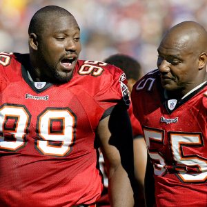 Ahanotu played for  the Bucs for nine years and ranks among the top 5 in sacks on the team.  (A sack is when a defensive player tackles the quarter back of the offense behind the original line of play, also called the line of scrimmage.  A sack moves the offense backwards to the point of the sack).